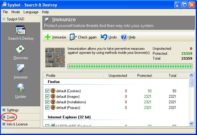 Many people are familiar with Spybot - Search & Destroy, but very few people realise the power of this wonderful application. Spybot has special protection for browsers to keep malware from infiltrating your system through weaknesses in your browser. The first level of protection is the Immunize feature. To Immunize your system, click on the Immunize button and wait for Spybot to scan your system for vulnerabilities.