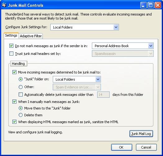 - Move incoming messages determined to be junk to: "Junk" folder on Local Folders